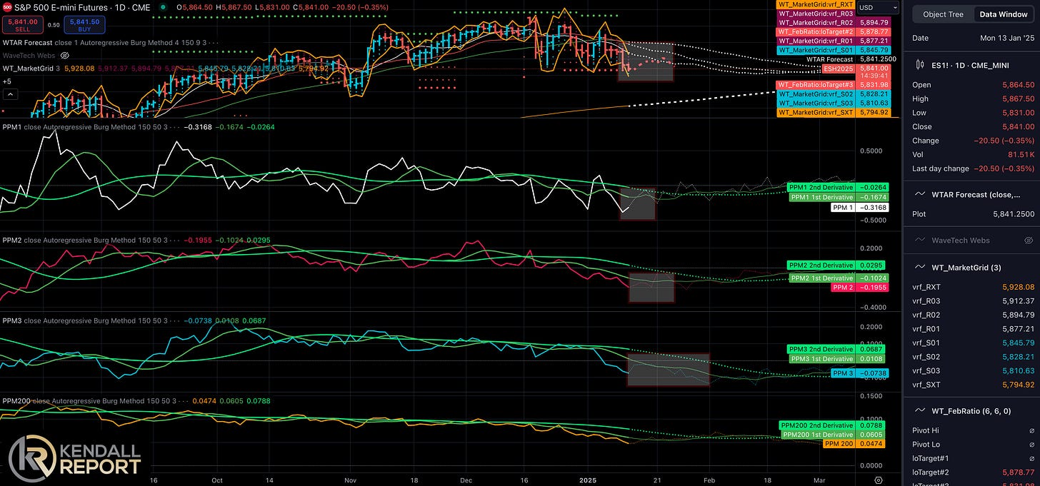 The intermediate-term charts align with this bearish bias, indicating deeper support at 5760, which could extend beyond as January concludes. The convergence of both daily and intermediate timeframe signals strengthens the likelihood of ongoing downward pressure, although short-term consolidation or minor rebounds may occur around key economic data releases.