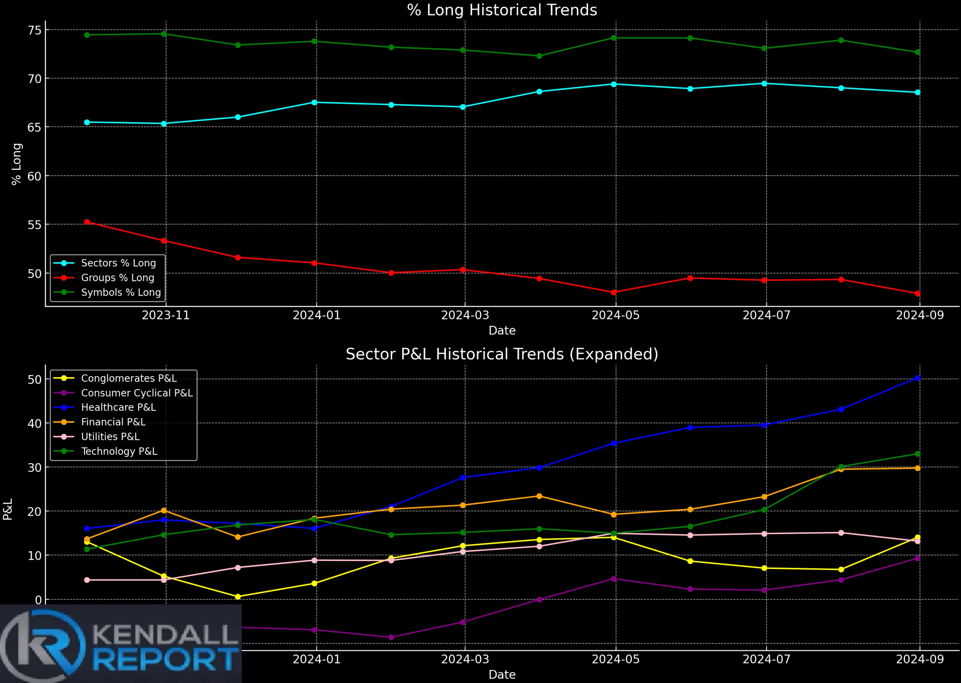 Let's break down what I am seeing in the rotation. The sector percent long chart reveals a compelling story of stability among symbols, consistently hovering above the 60% mark and averaging around 65%. While the groups show a slightly weaker profile, they still hold steady at approximately 50% as we project into 2024.