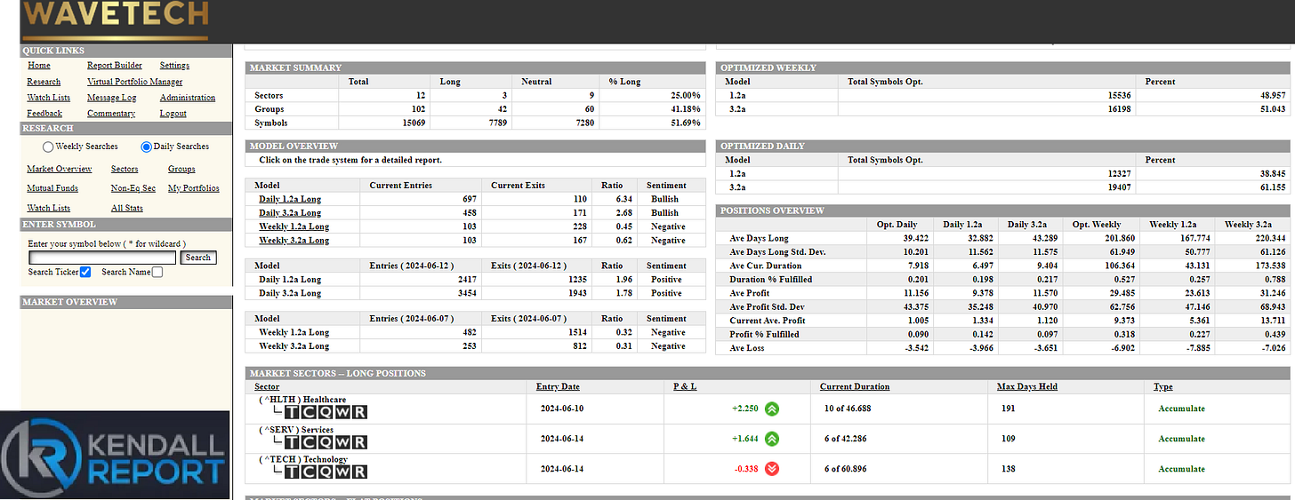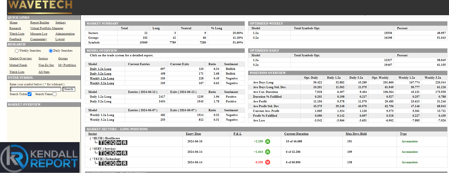 Despite mixed index performances yesterday, the short-term models indicated net buying activity with 1,155 new entries and 281 exits. The bullish percentage now stands at 51.69%. The sectors are holding steady, with only three sectors showing long positions, and there hasn't been any significant rotation in the markets.