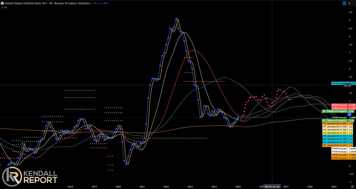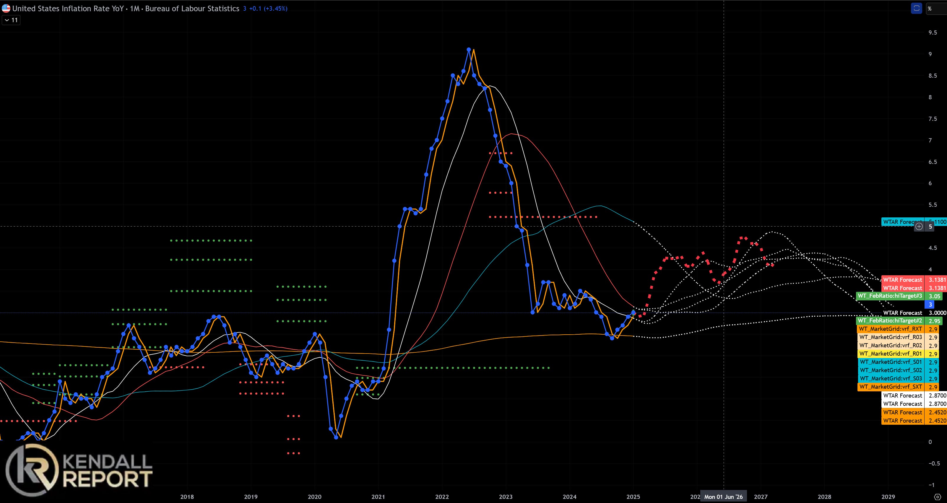 The broad market database, analyzing over 14,000 symbols, showed a slight negative rotation in short-term models, suggesting underlying stability despite market volatility. The inflation trajectory remains consistent with previous forecasts, with the red dot indicator suggesting a potential bounce to 3.8% or even 4.2%. This aligns with the ongoing discussion about inflation's echo effect that has been highlighted over the past six months.