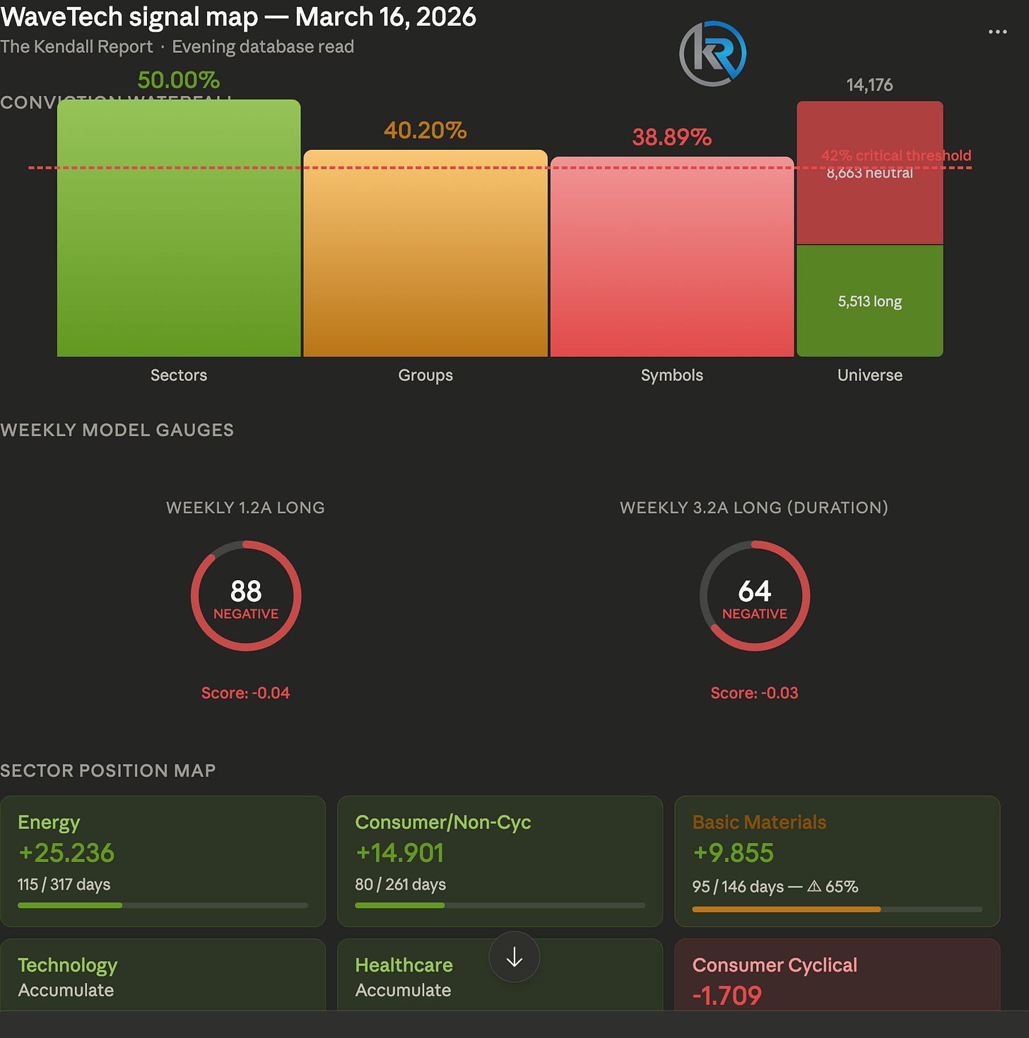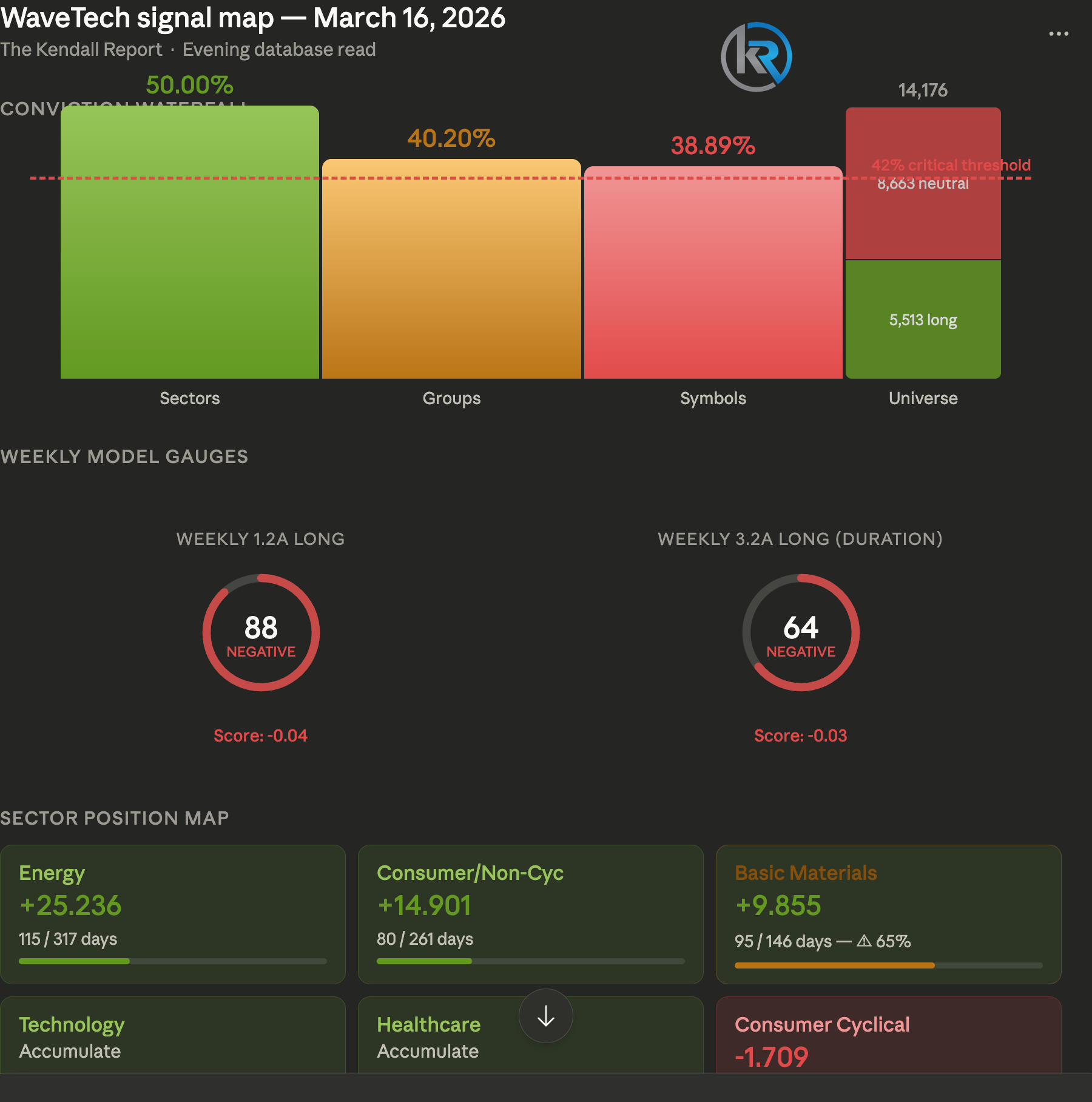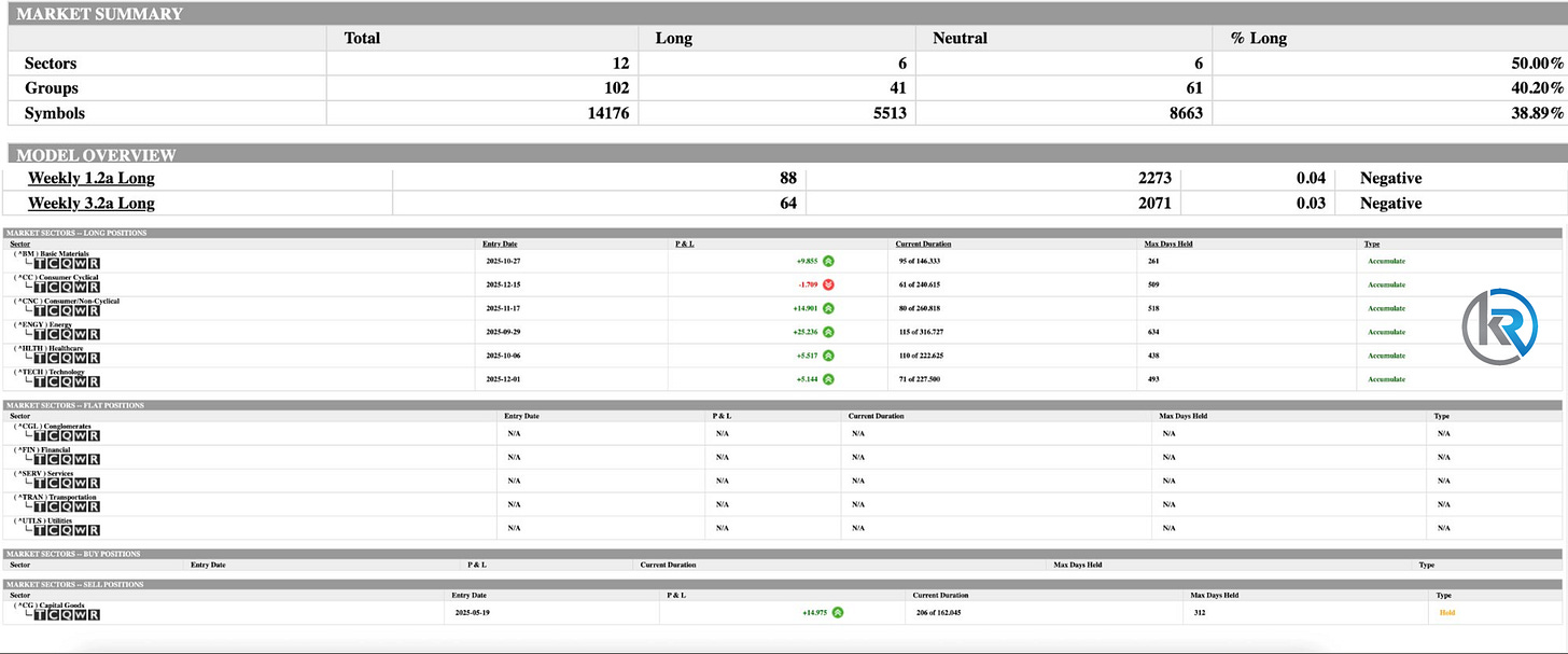 The broader takeaway is that the database is undergoing a liquidity drain at the individual stock level that has now pushed long conviction below 39%, a level that historically suggests further liquidation ahead rather than stabilization. The buy position section sits empty, confirming the system sees no actionable new entries in this environment. With weekly models negative, symbol-level conviction cratering, and the strongest remaining positions still carrying meaningful duration runway, the posture here is clear: protect the Energy and Consumer/Non-Cyclical winners, keep tight duration discipline on Basic Materials as it approaches maturation, and resist the temptation to add exposure until the weekly models show any sign of turning.
