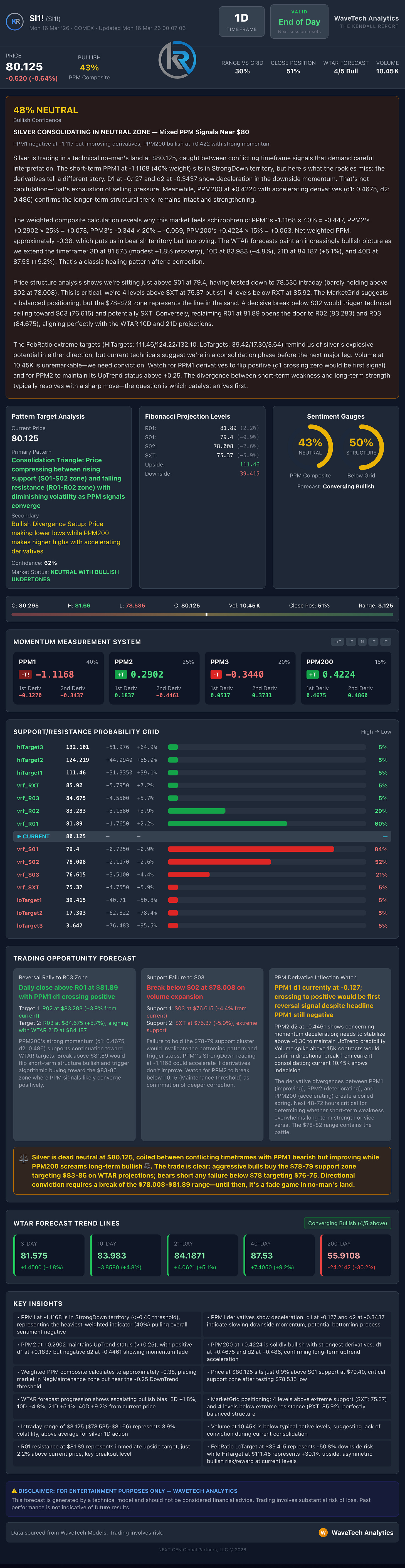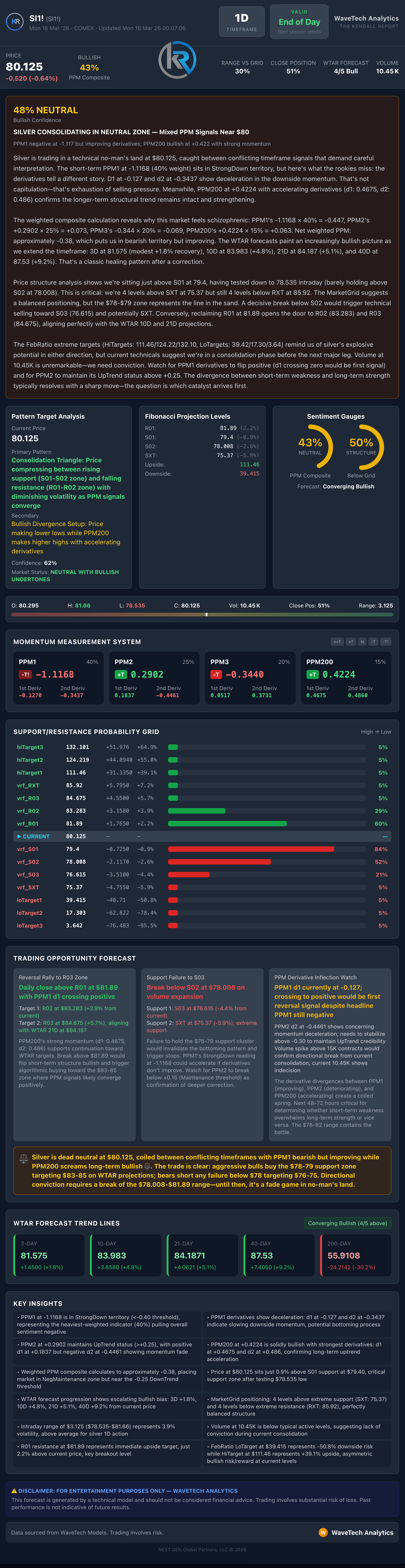The weekly models confirm the bearish trend with both readings remaining in negative territory. Weekly 1.2a Long is at 88 with a score of 0.04 negative, while the longer-duration 3.2a Long shows an even weaker 64 with 0.03 negative. The simultaneous negativity across both timeframes with the longer-duration model displaying the softer absolute reading continues to be the main headwind pattern that has persisted since early March, and there is no sign of a change. Until at least one of these models shifts, any long positions at the sector level risk weekly weakness eventually spilling over into daily signals.