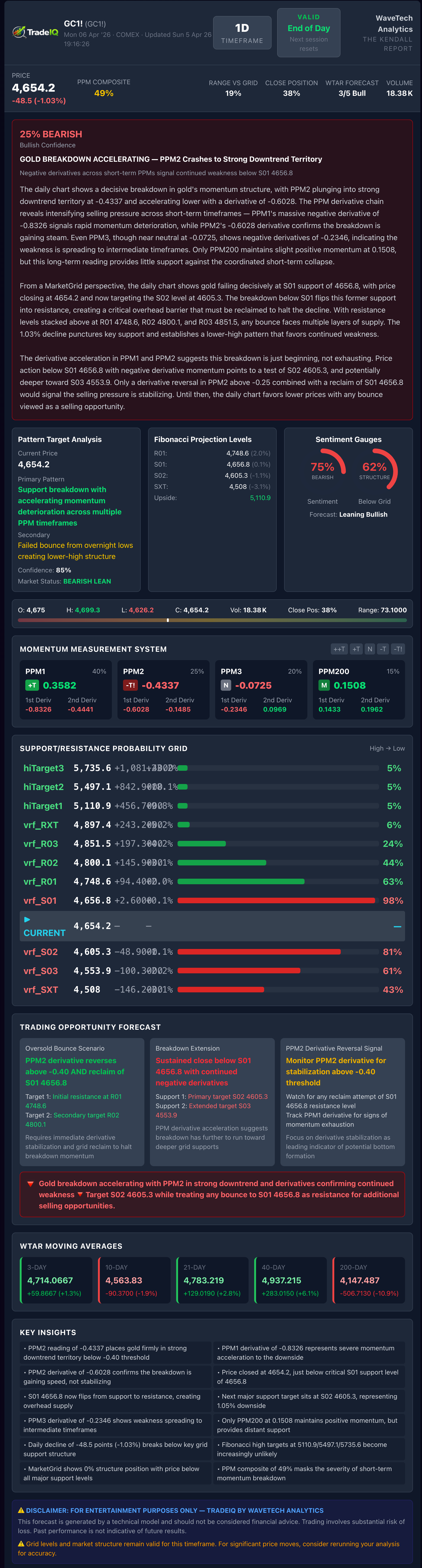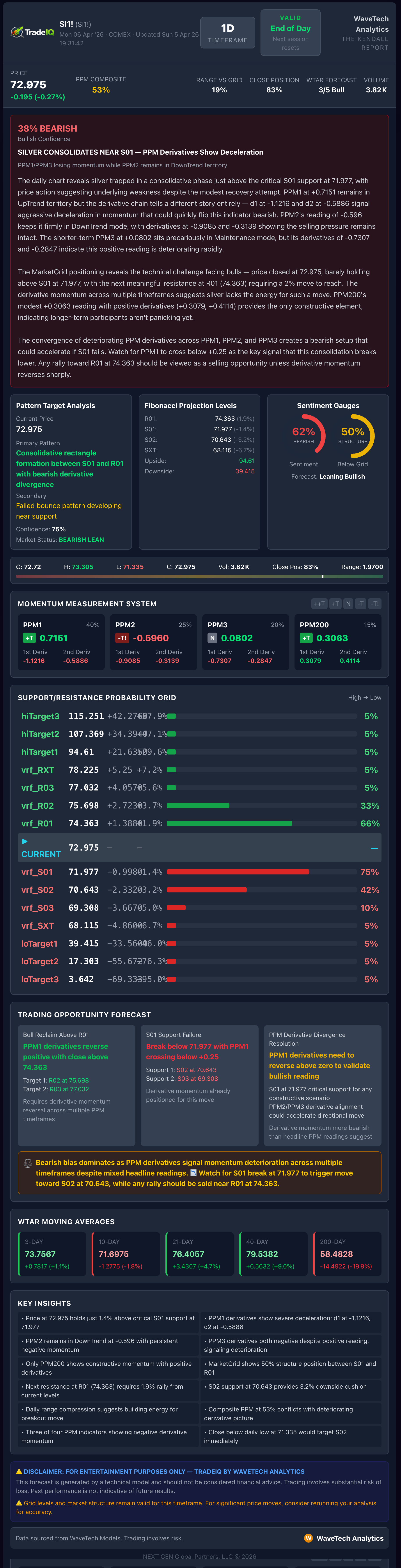The Wave Tech database currently tracks 14,166 symbols across 12 sectors and 102 industry groups. Of these, 3,529 symbols are long, and 10,637 are neutral, resulting in an overall bullish percentage of 24.91%. At the sector level, 5 out of 12 sectors are long, making up 41.67%, while 36 out of 102 groups are long, or 35.29%. This 24.91% reading on symbols is well below the critical 42% positive rotation threshold and falls within the 22% to 28% neutral-to-negative zone, indicating the broad market lacks the internal breadth needed for sustained upside. Although the market has not broken the 22% full liquidation level—which is positive—it is still far from the 48% to 52% zone of adequate traction or the 58% to 62% confirmed uptrend range.