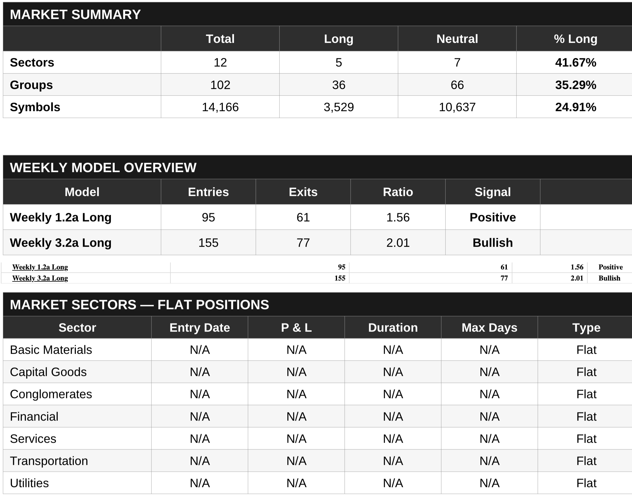 The Weekly 1.2A Long model shows 95 buys versus 61 exits, resulting in a 1.56 ratio classified as Positive, while the Weekly 3.2A Long model displays 155 buys against 77 exits, giving a 2.01 ratio labeled as Bullish. Combined, these models generate 250 total buy signals versus 138 exits, yielding more than 1.8 new buys for every exit. This is notable because, despite the subdued 24.91% bullish percentage, the models are identifying emerging opportunities at a rate that significantly exceeds the deterioration rate, suggesting that a base-building process may be occurring at the individual symbol level underneath.